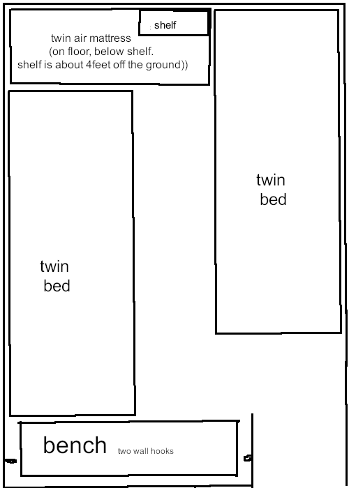 Some families have chosen to bring an air mattress and rearrange their room to accommodate three family members as shown on the following rough sketch (not completely to scale).