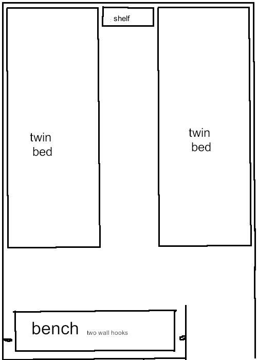 An individual room will look like this, or be a mirror image of this with the entry door on the left and the bench on the right.